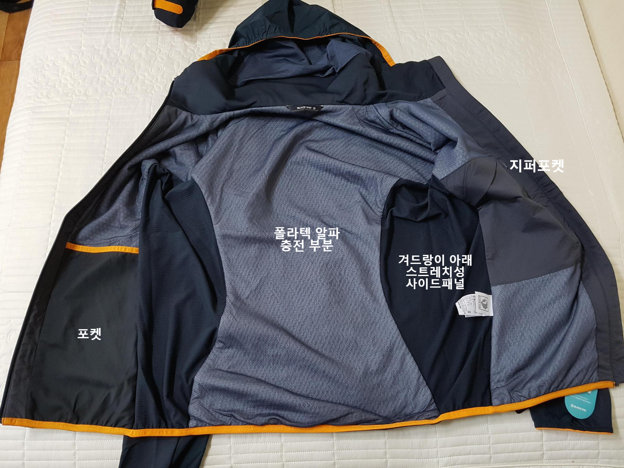 전면부와 등판, 어깨 등 밝은 회색 부분이 폴라텍 알파가 얇게 충전돼 있는 부분이고(내부 포켓 부분 포함), 팔 안쪽과 겨드랑이 아래 옆구리 쪽으로 비교적 얇은 스트레치성 사이드패널이 있어 움직임과 통기성이 좋을 것 같습니다.
