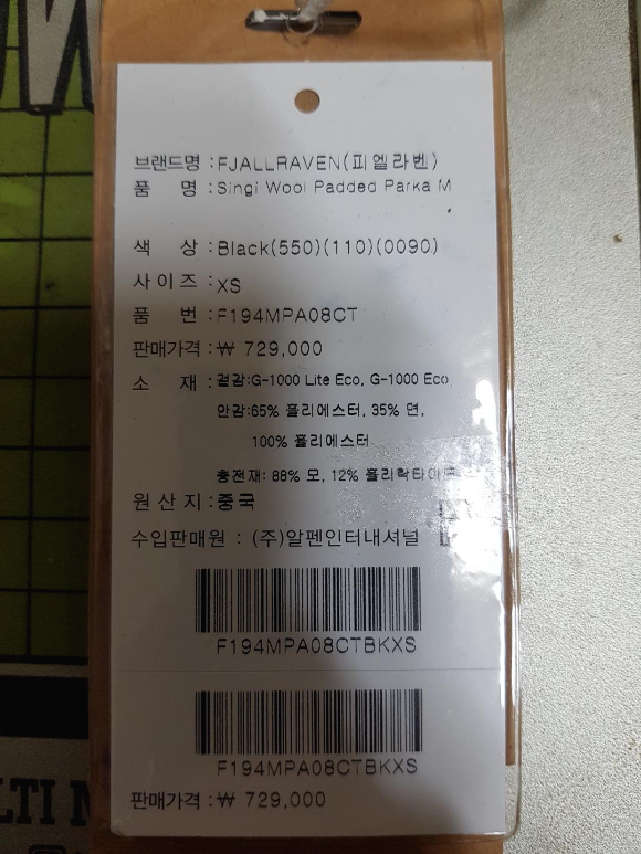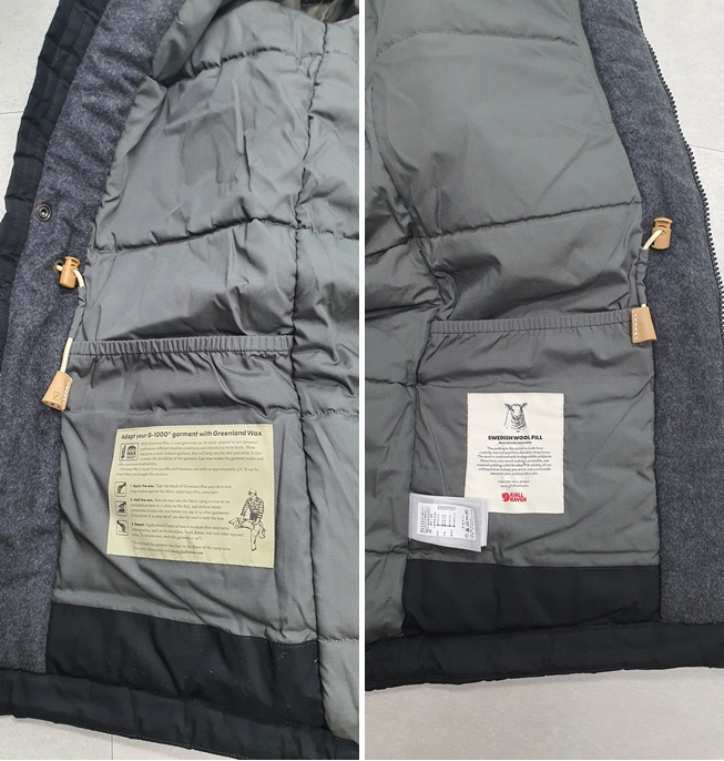 충전재는 스웨덴산 울이고, 두께상 좀 긴 경량패딩 정도의 내한성을 가지지 않을까 생각해 봅니다.